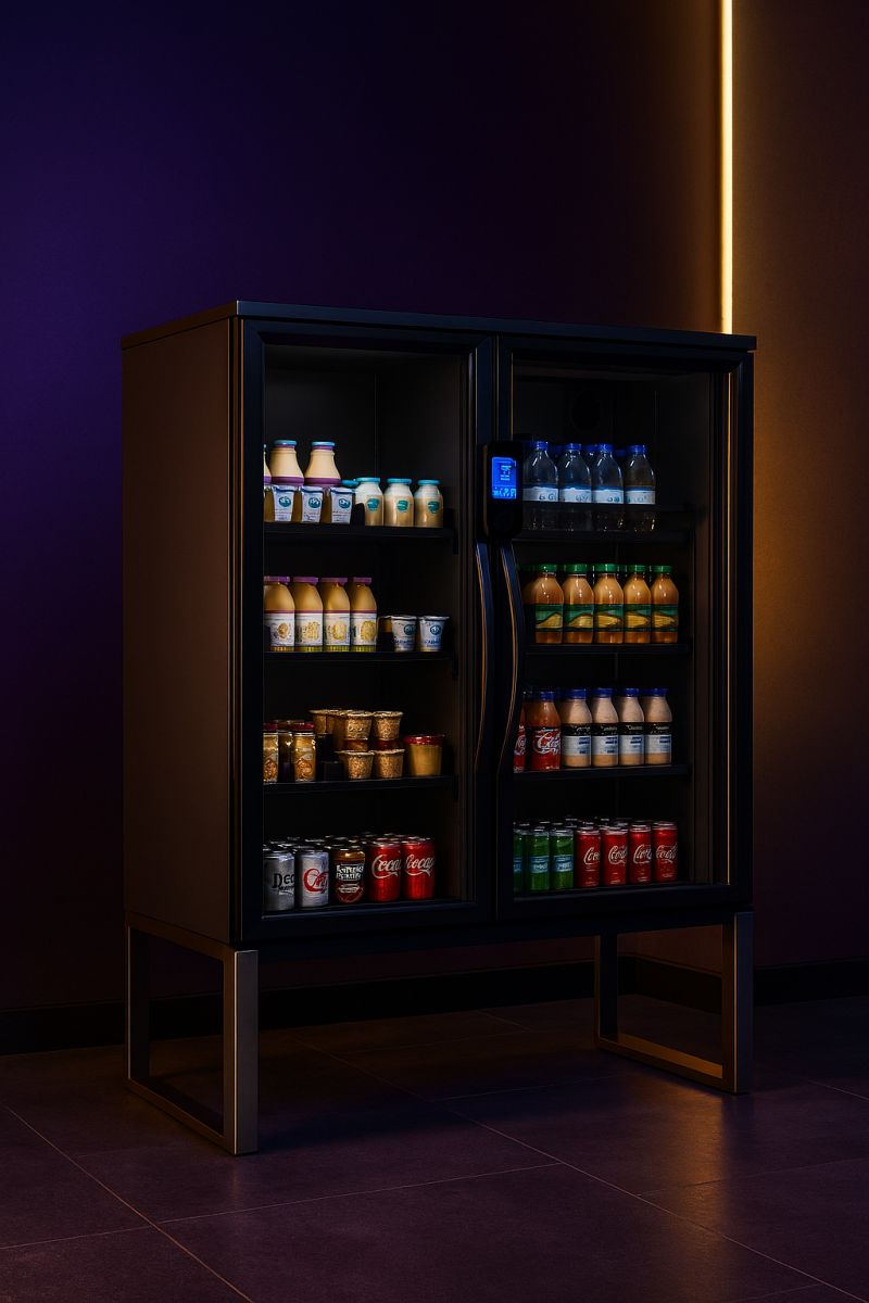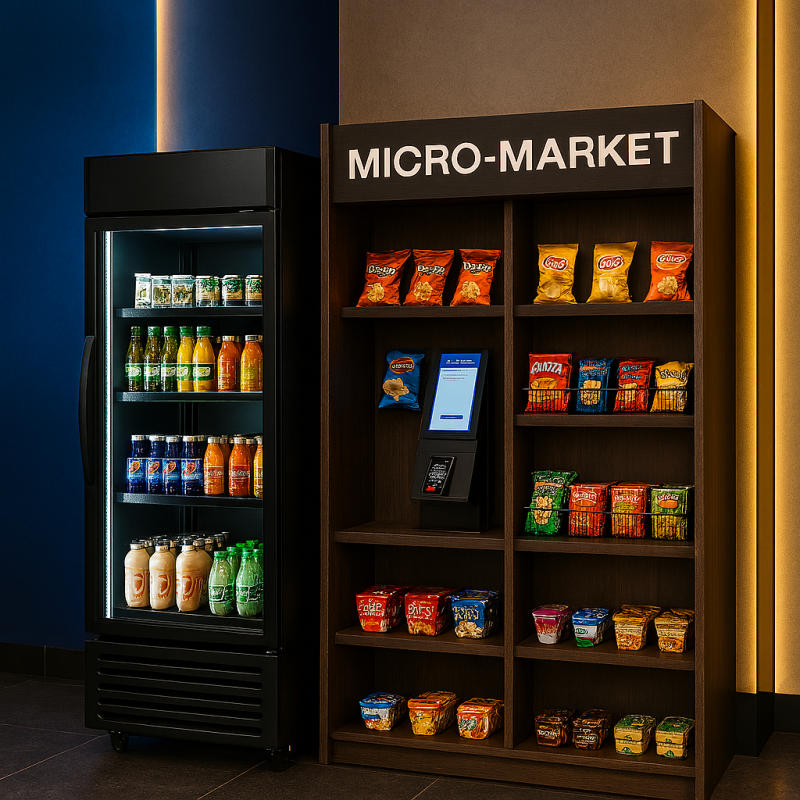 Open-access shelves, refrigerated coolers, and touchscreen kiosks come together in a modular setup that turns any breakroom, lobby, or lounge into a 24/7 micro-market. Great for larger offices, hotels, and residential buildings.